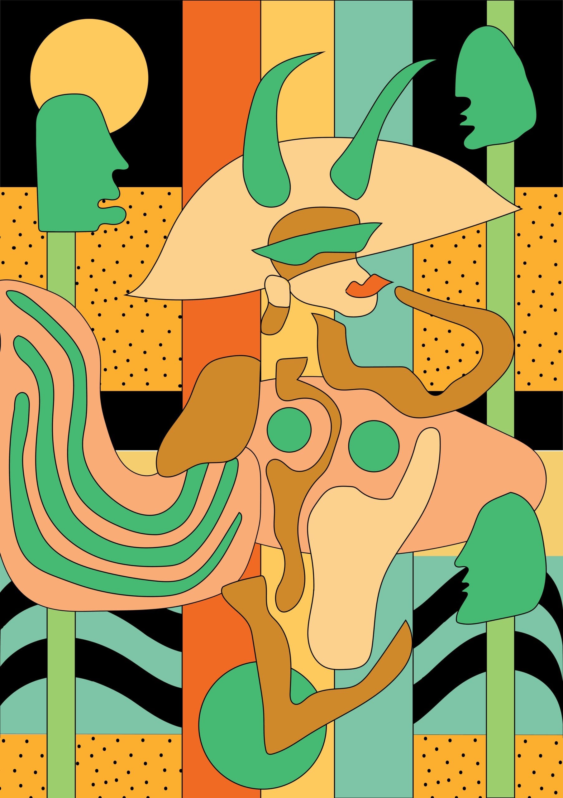 In the natural passion and love I have for the Earth and its living organisms, I imagine this enormous giant Goddess who works till exhaustion for the balance of the Earth and its life interactions. She travels into the ground again when its time for her to rest from her exhausting infinite duties on this Earth.